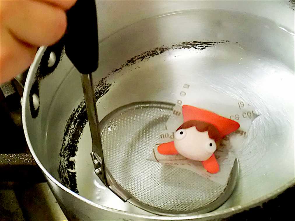 白玉でできたポニョは崩れやすいので、紙のシートにのせたままお湯の中にそっと入れて、浮かんでくるまでしっかりゆでます。お湯に入ったポニョ、かわいすぎます!