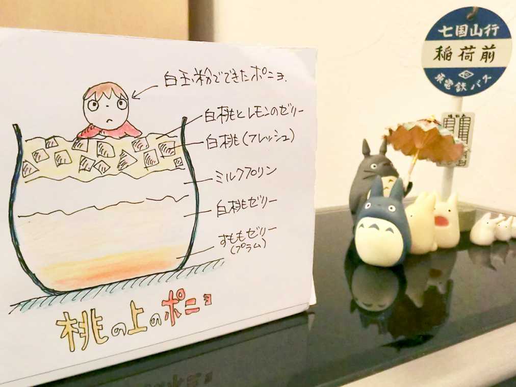 店頭にパティシエの“白髭さん”が描いたゼリーの解説図を発見!すもも(プラム)ゼリー、白桃ゼリー、ミルクプリン、白桃の自家製コンポートとレモンゼリーの4層にもなっていて、とても手が込んでいます。