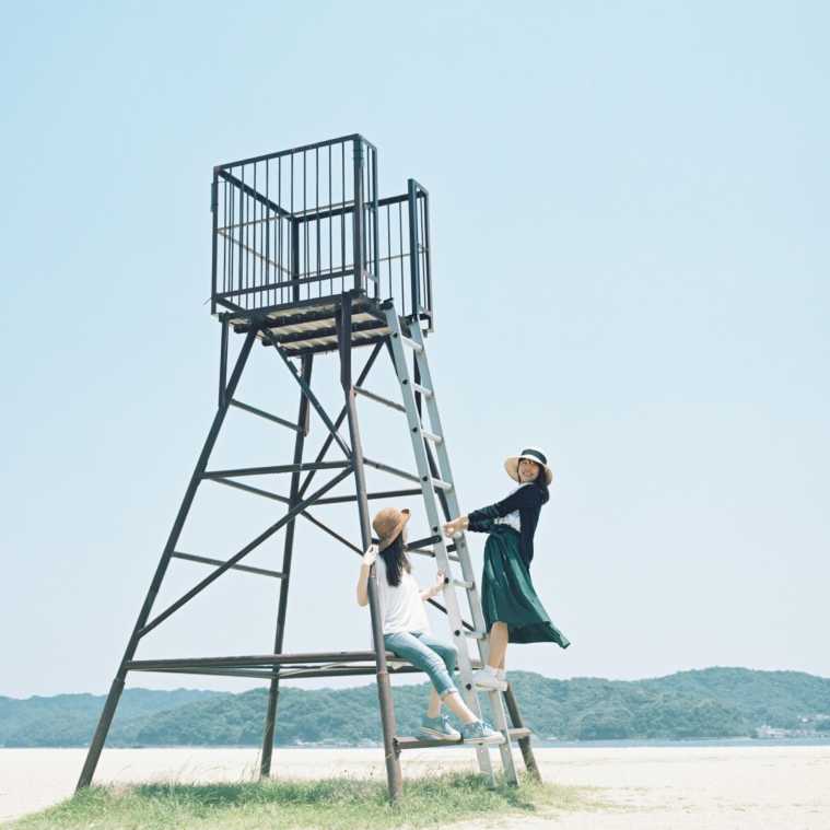 天橋立は、沿岸流により運ばれた砂によって自然に作られた地形ですが、上から見ると分かるようにたくさんの松の木が植えられています。幅が広いところでは砂浜も広がっており、夏場は海水浴やビーチバレーを楽しむ場所としても人気。監視台のようなものを発見しました。