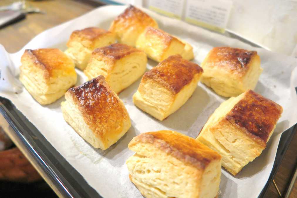 「このスコーンは長年研究を積み重ねて考案したレシピで作っています。パイとスコーンとクッキーのレシピを足した作り方をしているんです」。そう語るオーナーの言葉通り、表面はパイのようにサクッと、側面はクッキーのようにパリッと、中はスコーンのモチッとした柔らかな食感を味わえます。
