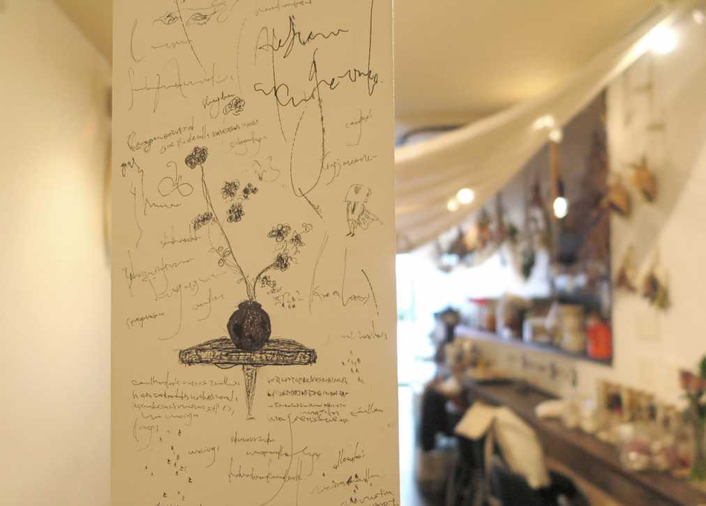 こちらの柱に描かれた絵は、店内で展示イベントを行った際にイラストレーターの髙栁浩太郎さんが描いたもの。店内では、不定期で絵や雑貨など、さまざまな作家の展示を開催しているのだとか。