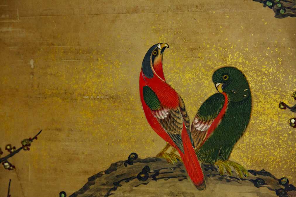 オウムのつがいは、羽毛一本一本まで丁寧に描かれていて美しい!神職さんによると、玉置神社は江戸時代、皇族が代々門主を務めた京都の寺院「聖護院門跡」に属していたそう。皇族を迎えるにふさわしい建物にするため、これほど見事な襖絵が描かれたのだとか。