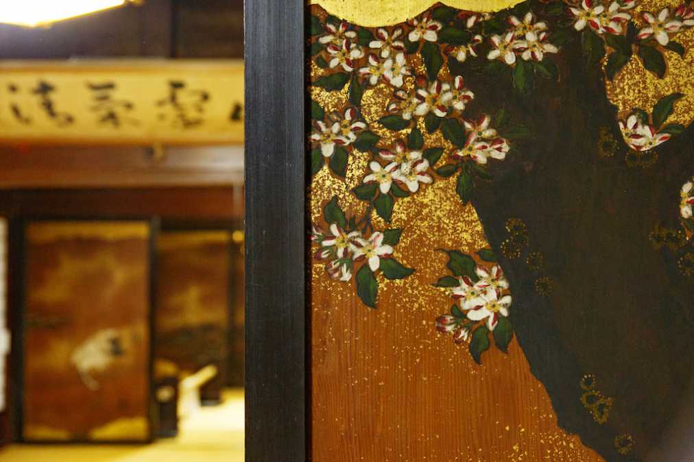 境内をひと巡りした後は、社務所(重要文化財・1804年建立)へ。外界とは異なり、室内はなんとも雅やかな世界。杉の一枚板で作られた戸や壁で仕切られた10部屋があり、60枚以上に及ぶすべての杉板に、狩野派によって鶴や孔雀、牡丹などの絢爛豪華な彩色絵が描かれています(拝観料500円)。