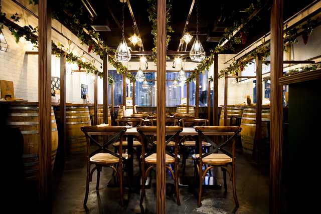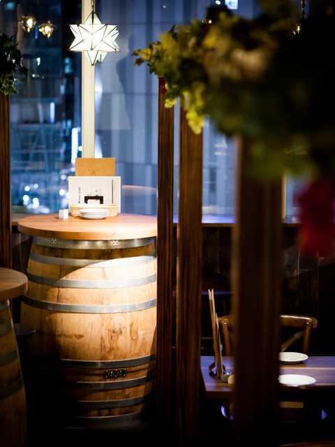 有楽町駅徒歩3分、ビルの最上階にある「有楽町SORAバル」。メインフロアは、フランスのワイナリーをイメージした広々空間が印象的。