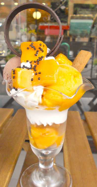 続いては、パフェの上にのった円形のリングチョコレートが目を引く、定番人気メニューの「クープグラッセエキゾチック」(1400円)を注文。ジューシーな完熟マンゴー、ビターチョコのアイス、マンゴーソルベ、生クリーム、チアシードがぜいたくに使われています。オレンジ色のマンゴーが食欲をそそられる!