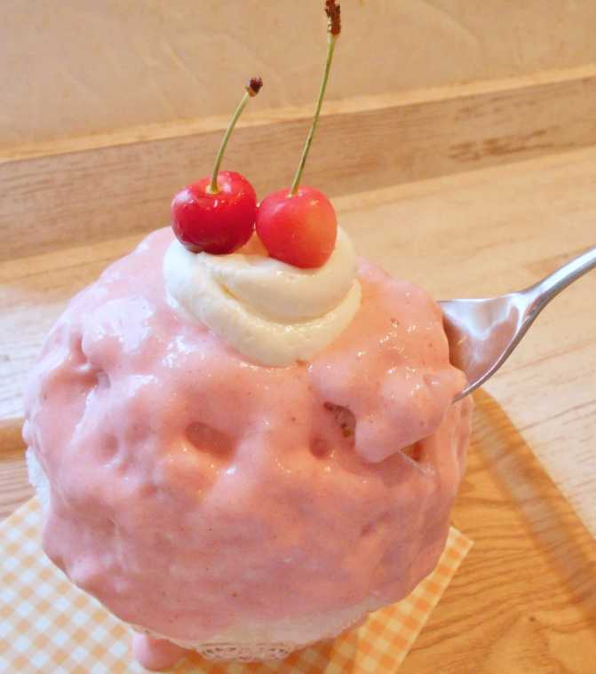 真ん丸と形が整ったら、最後は練乳と自慢のエスプーマをたっぷりとかけていきます。その上には、はちみつ入りのクリームチーズとさくらんぼをトッピング(トッピングのフルーツは変更する場合もあり)。