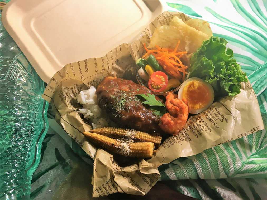 “アイランドビーチバー”をテーマにした「SCREW DRIVER」では、各島国を代表するRUMカクテルやフードが。特製ソースのロコモコ丼をメインにした「ビーチボックス(※写真)」(1500円)は南国感満載!