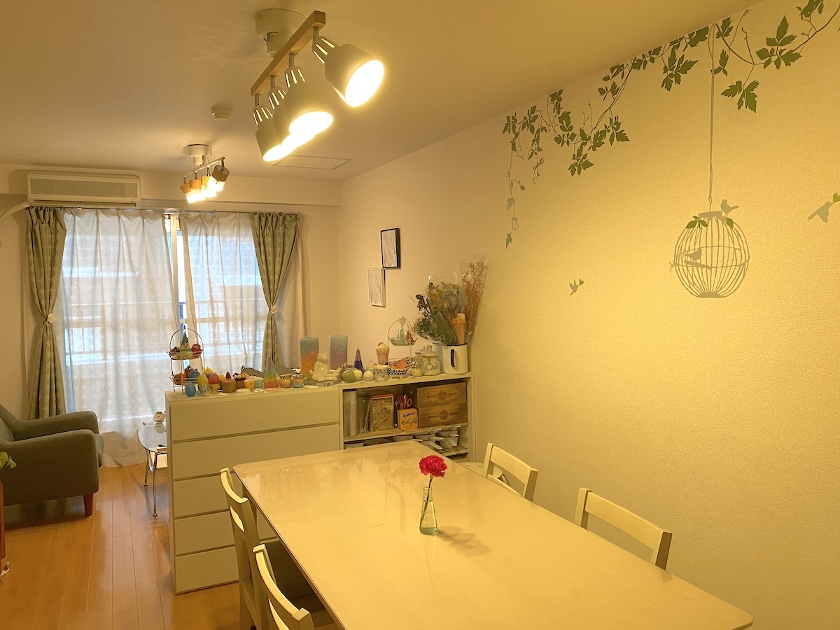 室内には石けんやキャンドル、花などが並べられていてキュート。友達の家に来たかのようにリラックスして体験できるのもポイントです。体験は室内手前のダイニングテーブルで行います。