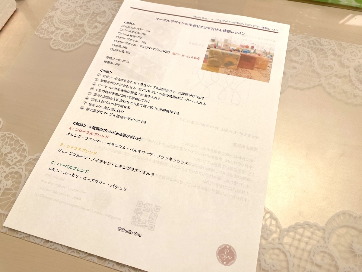 今回は参加したのは「マーブルデザイン 手作りアロマ石けん体験レッスン」7700円。まずは石けんの作り方や材料などについて講師のお話からスタートです!