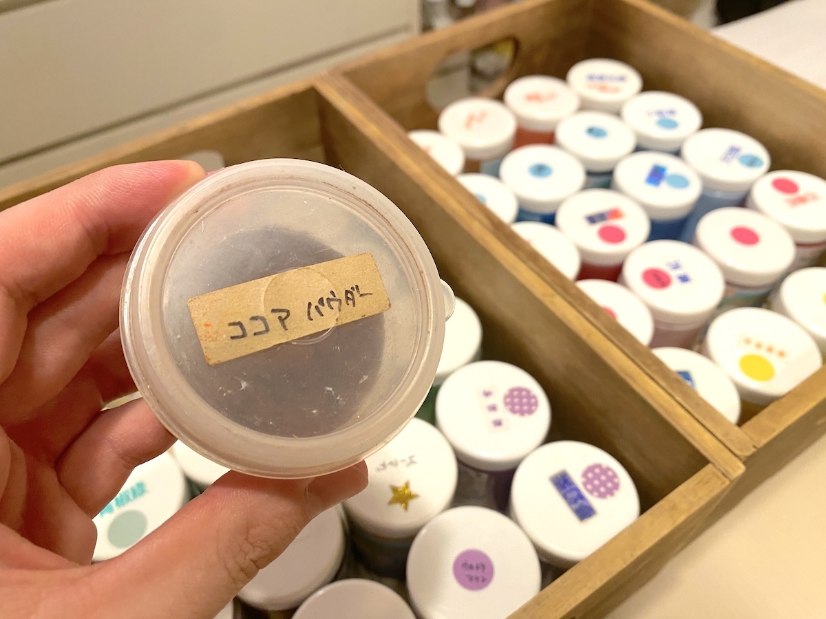 香りが決まったらカラーを決めていきます。約40種類のラインナップのなかから4色を決めていくのですが、同じ赤でも幅広い濃淡があるので細かく表現できるのがうれしい!また、色材なかにはココアパウダーもあってびっくり。せっかくなのでココアパウダーをベースにチョイスしてみることに。マーブル模様になったときのビジュアルをイメージして選んだのは、名前の通り青空のようなブルーの天空藍と、カスタードクリームのようなイエローの鵝黄色(うー ほわん)、ホワイト、ココアパウダーです。