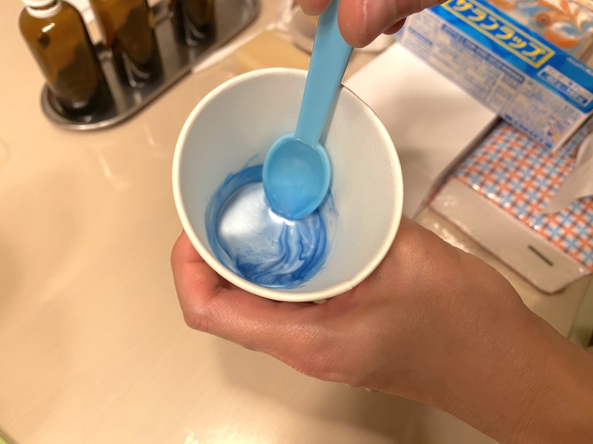 決めた色材は、紙コップに注いだオリーブオイルに溶いていきます。ダマがなくなるように混ぜるのがコツです♪