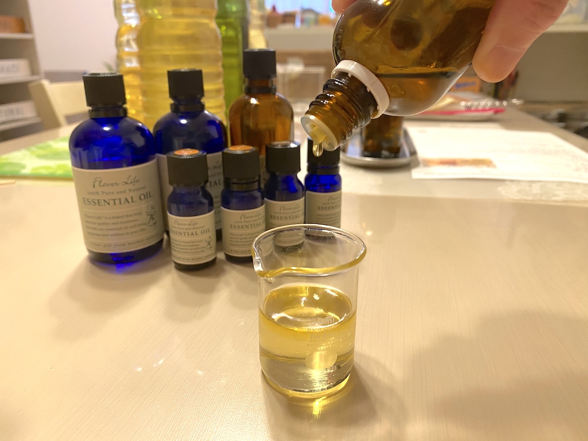 そしたら次はアロマブレンド用のオリーブオイルに精油(アロマ)を100滴たらしていきます。精油は、オレンジやラベンダーなどを合わせた華やかな香りのフローラルブレンド、グレープフルーツやレモングラスなどのさわやかな香りが特徴のシトラスブレンド、ユーカリやローズマリーなどのすっきりとした香りが魅力のハーバルブレンドの3種類からひとつ選びます。ここで香りが決まるということでじっくり悩んだ結果、今回はシトラスブレンドをセレクトしました。