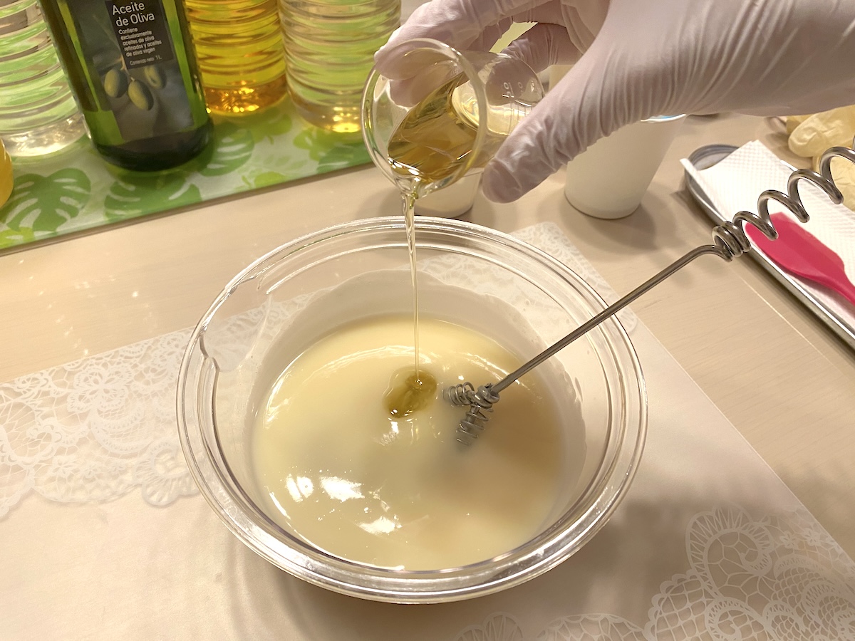 色が白っぽくなり、とろみもついてきたら攪拌完了。そこに香りづけしたアロマブレンド用の油を混ぜ合わせます。石けんぽさが感じられる見た目に変化してきたことでワクワクしてきました!