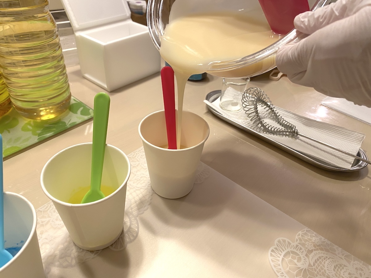 香りをつけた生地のもとを色付きの各オリーブオイルに分けて合わせたら生地が完成です。