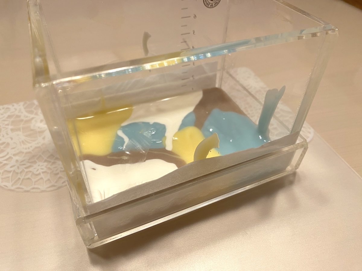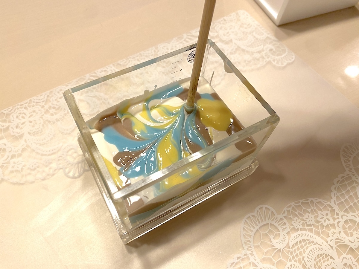 綺麗なマーブル柄に仕上げるため同じ色がまとまらないように流し込んでいきます。この作業を3層繰り返していくのですが、講師の方にお願いすることもできるので不安な人は頼ってみるのもよさそう!