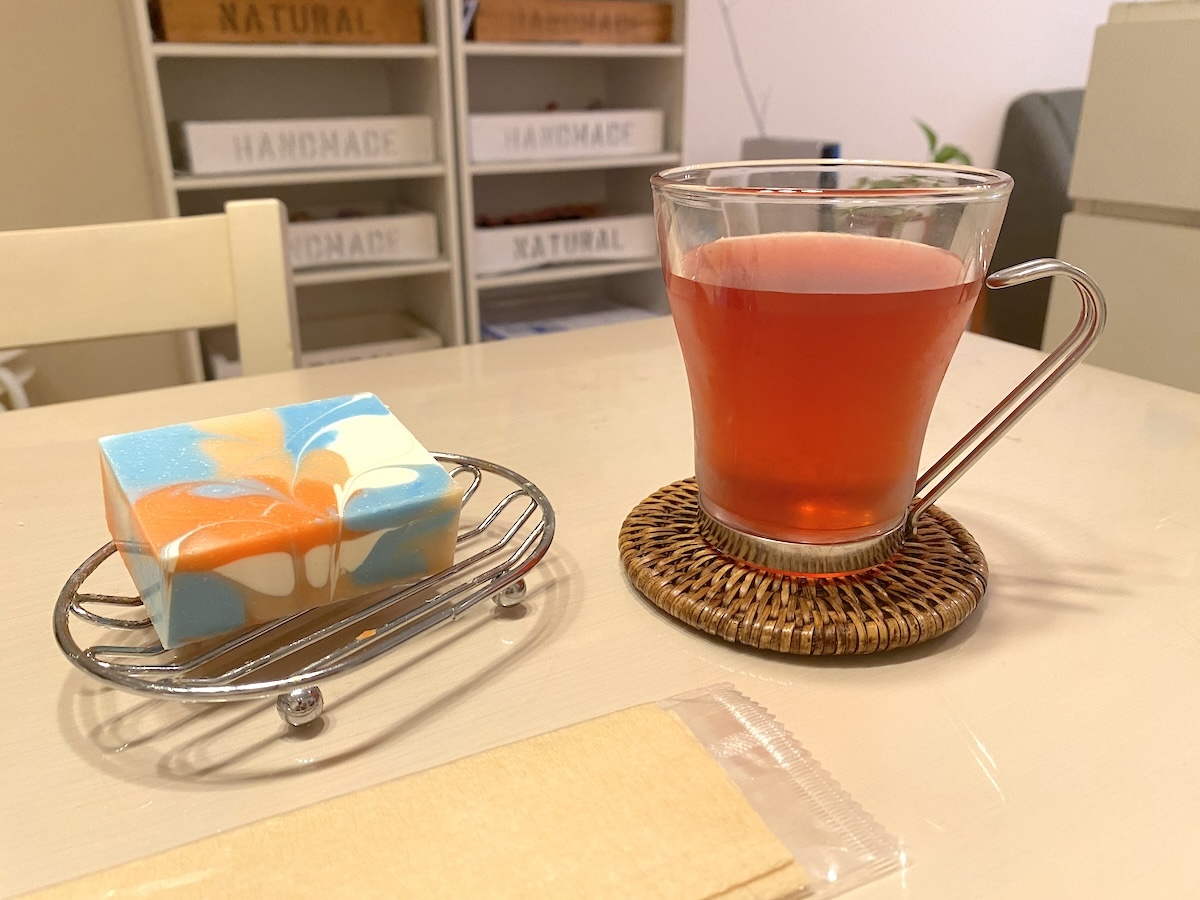 作業のあとはハーブティーのサービスが。講師と今日の体験を振り返ったり、雑談をしたりしてリラックスします。体験をとおして他のレッスンにも興味が湧いた人は、このタイミングで色々質問してみるのもいいかもしれませんね!