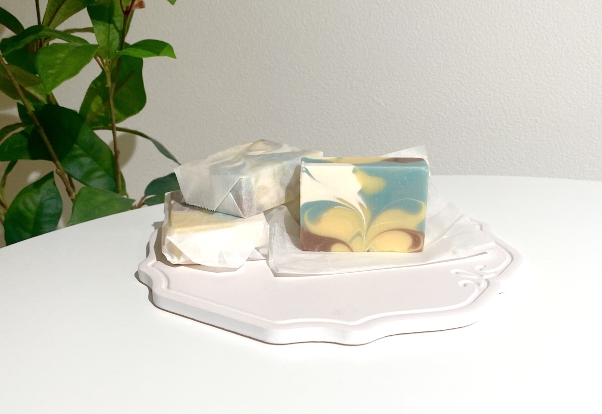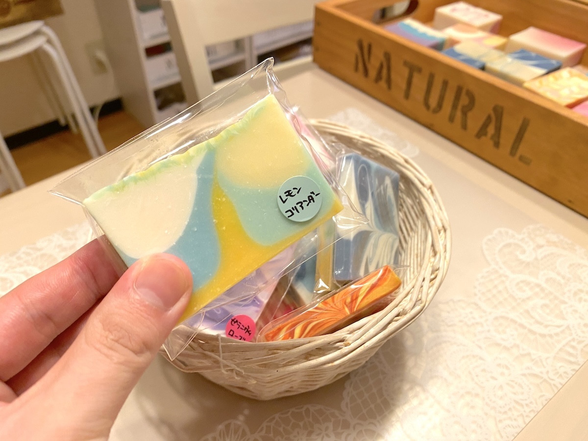 帰り際には自分で作った石けんが使えるようになるまで楽しめる石けんをプレゼントしてもらえます。見た目で選ぶもよし、香りで選ぶもよし、お好みの石けんを持ち帰ってまずは手作り石けんの良さを堪能してみて。
