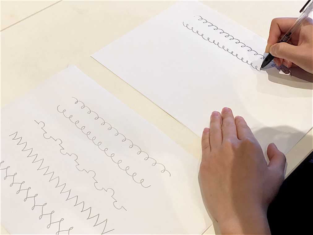 文章の7割はひらがなで構成されていると言われているため、まずは柔らかい曲線を書く練習をします。力を入れ過ぎると角ばった線になってしまうので、ほどよく力を抜きながらなめらかにペンを走らせます。これが意外と難しい!