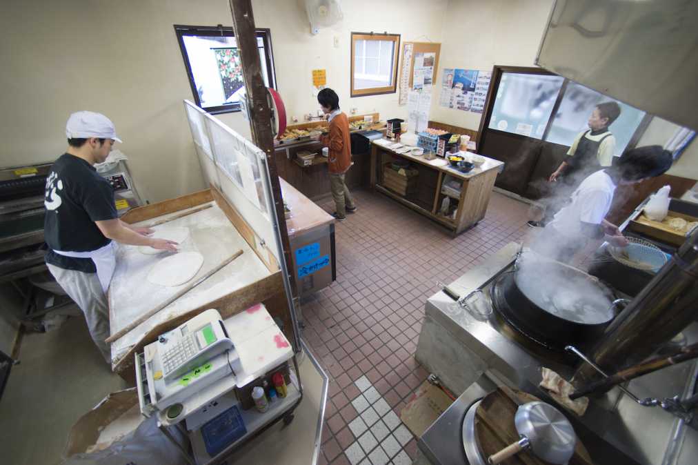 のれんが掛かった入口からセルフスペースに入店。なかむらのセルフスペースは、麺を打ったり茹でたりする調理場と一体になっているため、麺を作る様子が間近で見られることも。厨房にお邪魔するという、本場のうどん店ならではの臨場感を体感できます。