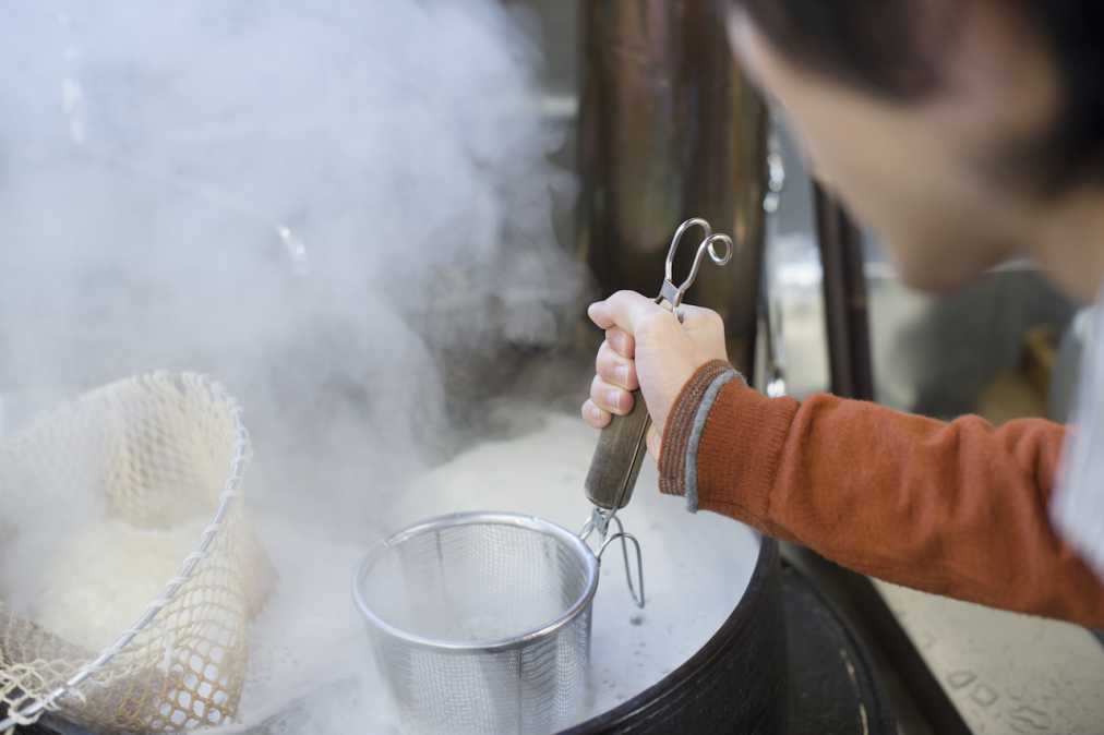 温かいかけうどんの場合は、自分で麺を温めます。「テボ」と呼ばれる持ち手の付いた小さなザルに麺を入れ、湯が沸き立っている大釜の中にドボン!5秒ほど浸したらしっかり湯を切って、器に戻します。温めすぎると麺がのびてしまうので要注意!