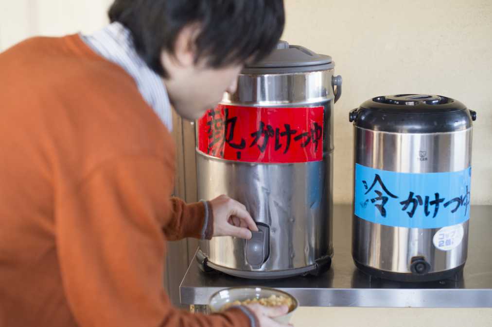 会計を済ませたら、セルフスペースの外へ。出口のすぐ近くにだしが入ったタンクが置いてあるので、熱いor冷たいを選んで注ぎましょう。しょうゆうどん用の醤油やぶっかけうどん用の濃いめのだしをかける場合は、少量でOKです。