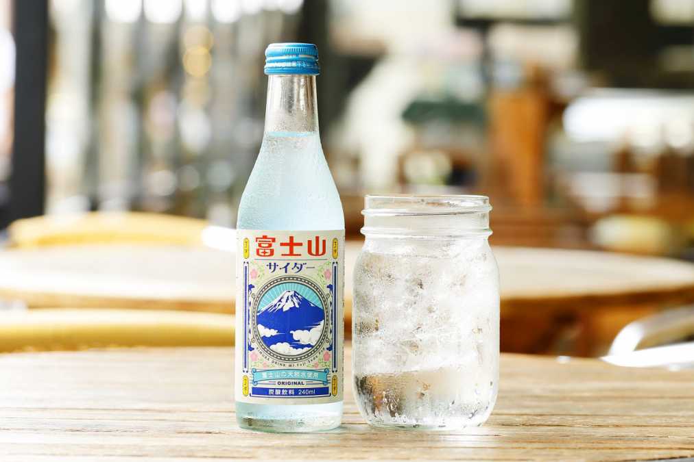 都内ではあまり味わえない、ご当地サイダー「富士山サイダー」550円。氷の入ったガラスびんに移して飲むと、爽快感アップ!