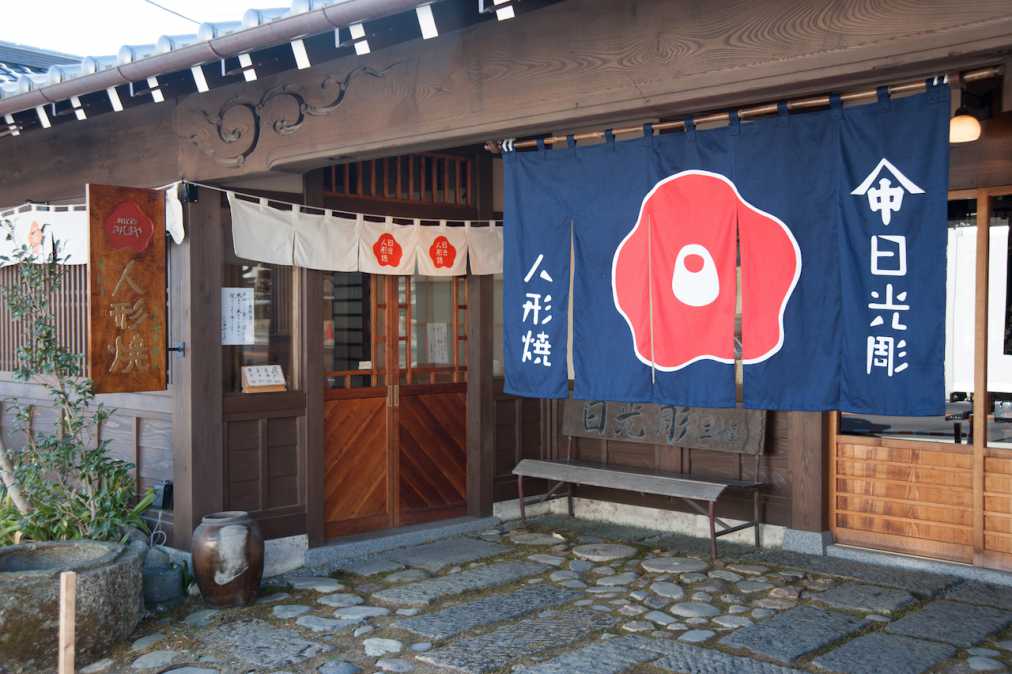 レトロな建物は、120年前ほどに建てられた民家を移築したもの。正面は日光彫の店「三島屋」で、その一角に人形焼の店「みしまや」が併設されています。