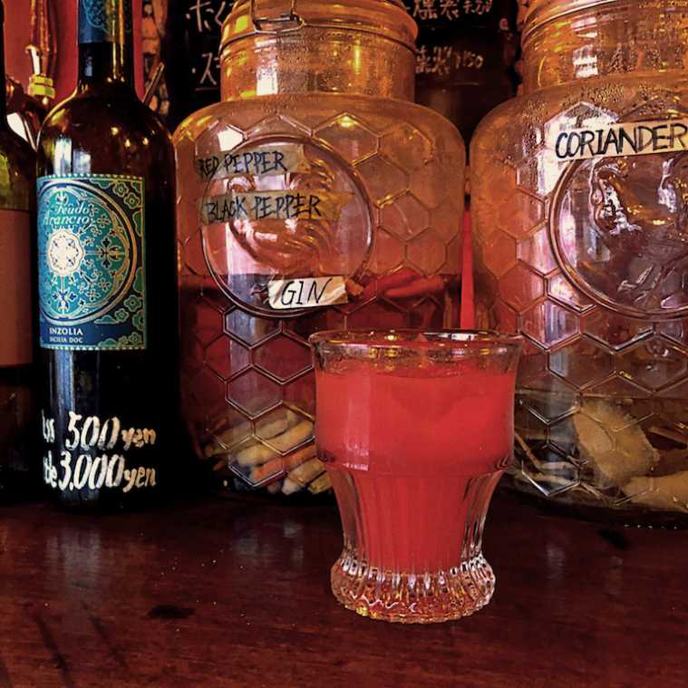 そしてカウンターにはこの店の名物、漬け酒がずら〜り!通年で飲むことができる「アールグレイの焼酎」や「コーヒーのウイスキー」のほか、シーズンによってフルーツや野菜を漬けたさまざまな種類の漬け酒が並びます。なかには、パクチーや唐辛子、さらにはお菓子のグミを漬けた変わり種も!