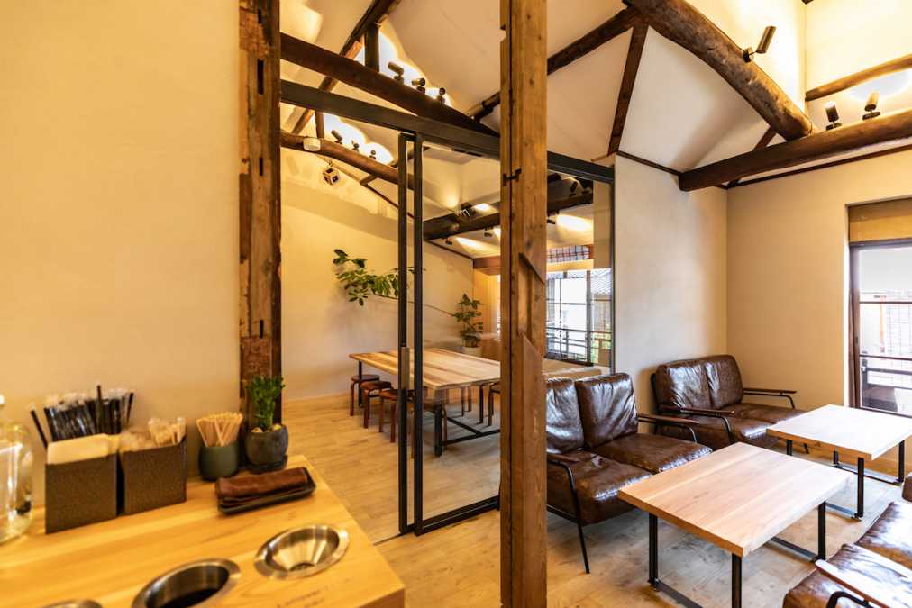 重厚な歴史を感じさせてくれる柱や梁はそのままに。テーブルやソファーも古い建物と調和して、ゆったりとした雰囲気を醸し出しています。