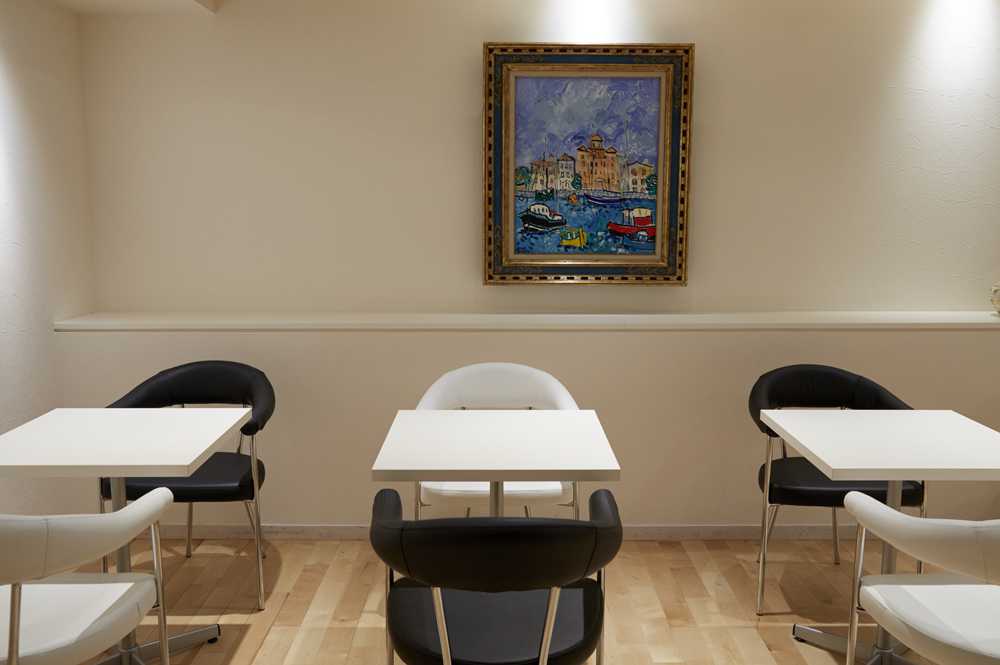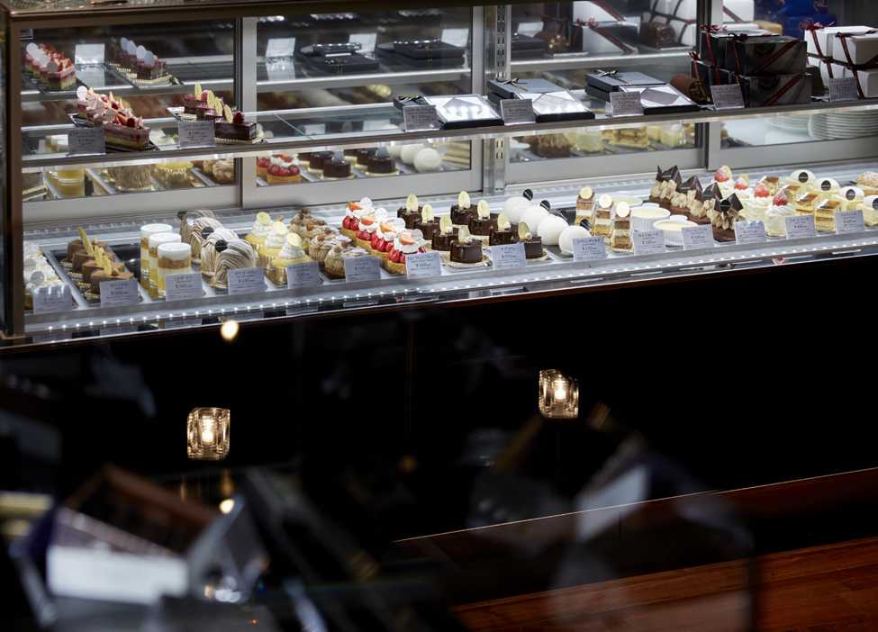 高級感あふれる落ち着いた空間には、美しい生菓子やチョコレートが並ぶショーケースが。まるで、宝飾店を訪ねたような雰囲気に気分も上がります。