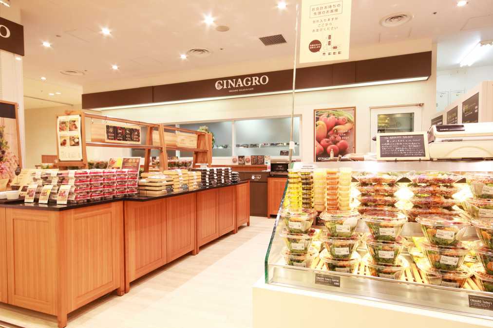 東京駅周辺の再開発の目玉として話題となった丸ビル。さまざまなお店が入り賑わいを見せる地下1階に、ひときわ大きな店舗を構えているのが「シナグロ オーガニックサラダ&カフェ」です。店先にはたくさんのサラダボウルが陳列されています。