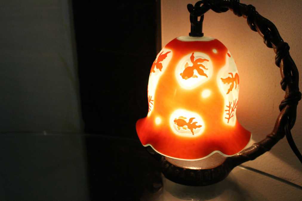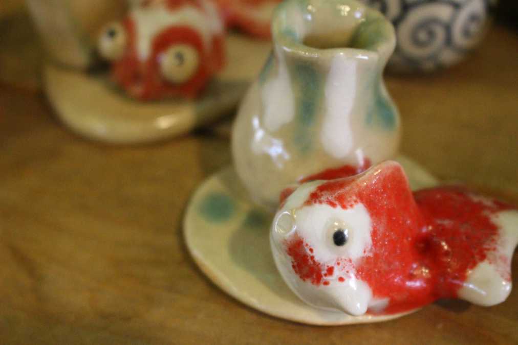 ランプや雑貨、箸置きや伝票立てにいたるまで、店のあちこちに金魚が。「こんなところにもいた!」と発見を楽しんでくださいね。