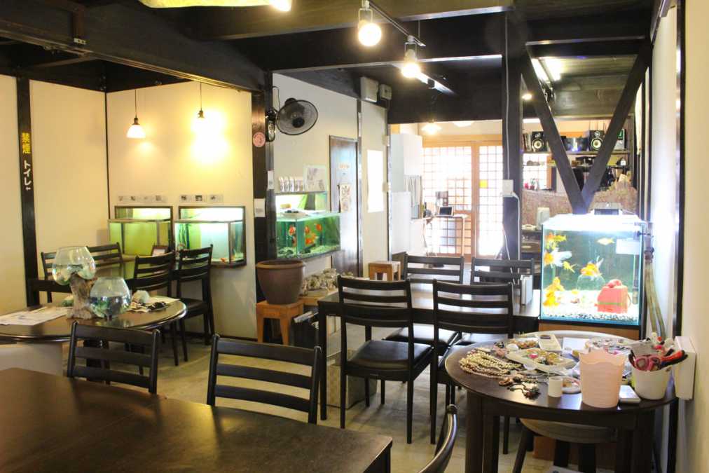 そんな通りにあるのが「きんぎょcafé~柳楽屋・陽だまり」。古い町家を利用した店内に、たくさんの水槽が並びます。昭和の雰囲気を感じさせる、ゆったりと落ち着けるお店です。