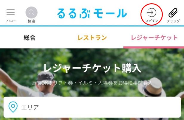 下記ボタンから電子レジャーチケットを取扱う「るるぶモール」にアクセスしていただき、右上の「ログイン」をクリックしてください。