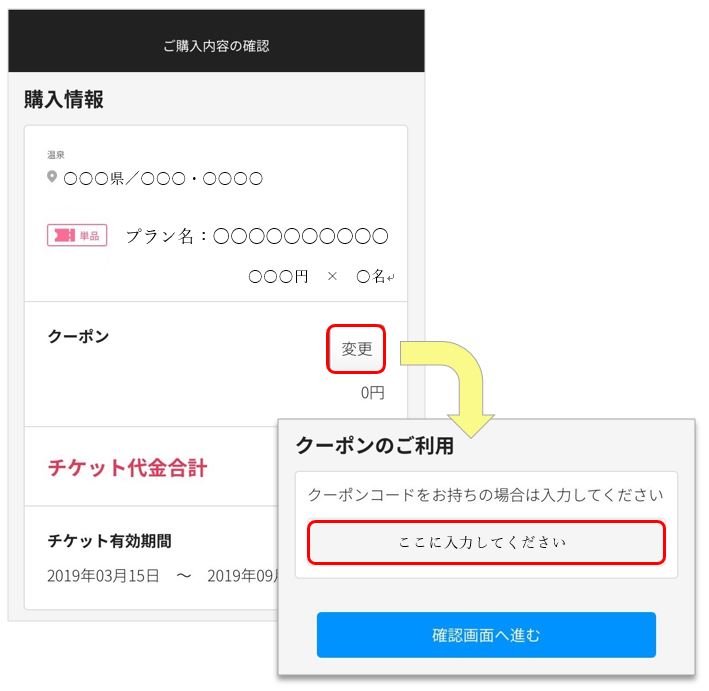 「予約・購入者情報の入力」を行った後、「確認画面」でクーポン「変更」から【クーポンコード】を半角で入力してください。