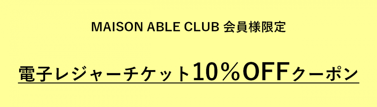 「MAISON ABLE CLUB」会員様限定の特典をご用意いたしました。お得におでかけが楽しめる電子レジャーチケット10%OFFクーポンをプレゼント!この機会にぜひ特典を利用しておでかけをお楽しみください。