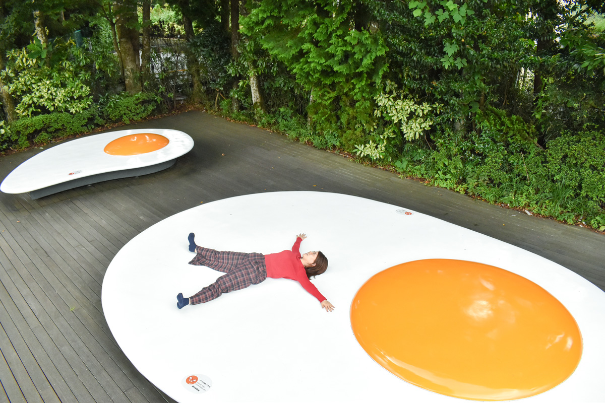 巨大な目玉焼きは、美術館らしい遊び心のある休憩スポット。ベンチとして座っても、靴を脱いでごろんと横になっても、お弁当を食べてもOKなんです。人物を中央に配して全景を撮影すると、サイズ感が伝わるユニークな写真が撮れますよ。