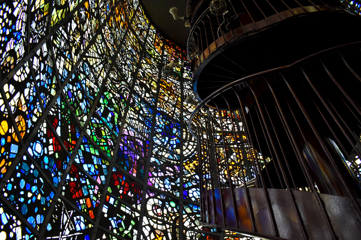 「幸せをよぶシンフォニー彫刻」は、高さ約18mの塔全体にステンドグラスが埋め込まれた作品。中から見ると、赤、青、緑、黄色といったガラスに外光が屈折し、なんとも幻想的!花や星、フクロウなどの絵柄があるので探してみて。らせん階段を上った屋上では、野外彫刻と箱根の山々が一望できます。