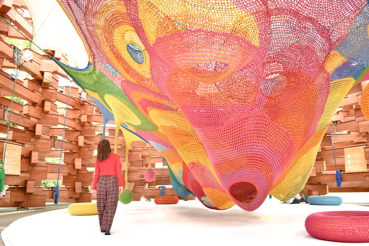 芸術の秋を感じに箱根へお出かけ。約7万㎡の庭園を持つ野外美術館「彫刻の森美術館」なら、自然の中で遊ぶ感覚でアートを楽しめます。写真は「ネットの森」で、体験型アート作品。ネットに上れるのは小学生までですが、大人もドーナツ型クッションに座ったり、一緒に写真を撮ったりできます。カラフルで形も面白いので写真映えはばっちり。