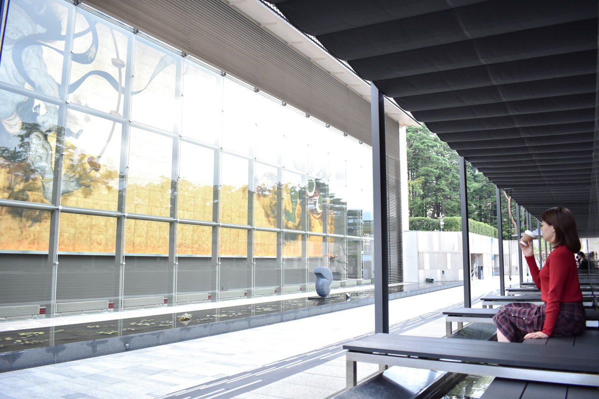 「岡田美術館」には敷地内に湧く温泉を活用した100%源泉かけ流しの足湯カフェも。美術館入館者は無料です。入場料500円で足湯カフェだけの利用もOK。目の前には風神・雷神の大壁画「風・刻(かぜ・とき)」(福井江太郎作)が展示され、アート鑑賞しながらひと休みできます。