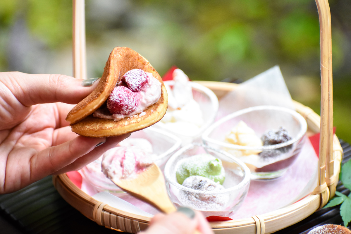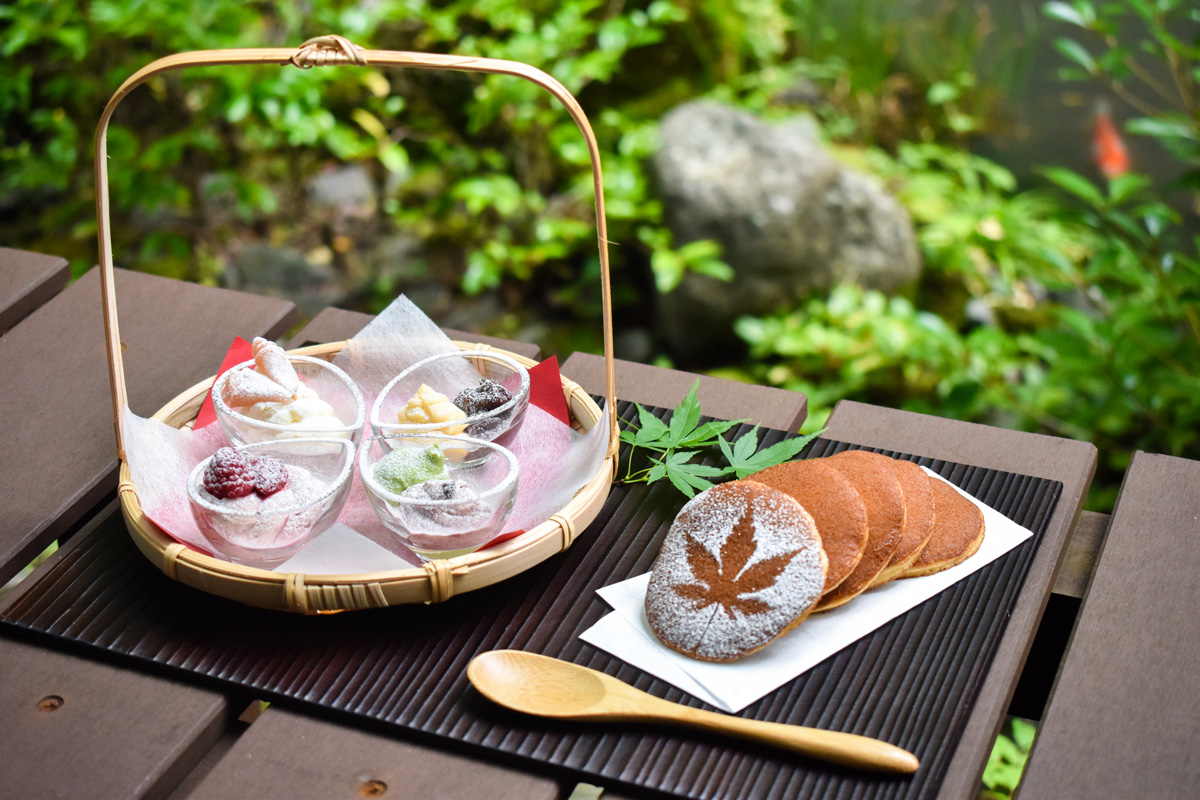 この時季、箱根でスイーツを食べるなら「箱根スイーツコレクション 2018秋」は要チェック。箱根エリアを中心とした33店舗で、秋らしいスイーツが期間限定で味わえるんです。写真は「岡田美術館」開化亭で提供しているお好みどら焼き(1000円、1日15食限定、14~17時提供、LO16時30分)。葉山にある「和がし 葉な」とコラボした逸品で、和の食材やフルーツを使った4種の特製餡をミニどら焼きにサンドしていただきます。