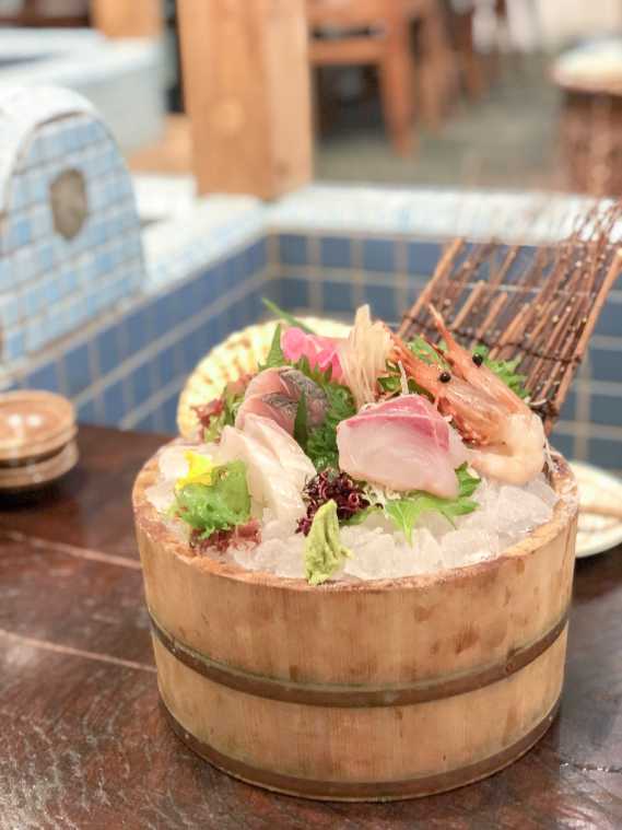 「分福」では、銭湯にまつわる食事と飲み物を楽しむことができます。写真は「お造りの五種桶盛り」(980円/二人前よりオーダー可)。なんと風呂桶にお刺身が盛られて出てきます!これは出てきた瞬間盛り上がること間違いなし!浴槽のタイルを奥に写せば、お風呂でご飯を食べたかのような写真が撮れるかも!?(どのお刺身が盛られるかは入荷状況によって変わります。)