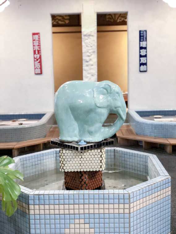 店内に入るとまず目に飛び込んでくるのは象の置物!当時は、写真奥に見える柱の左右で男湯と女湯に分けられていたんだとか。今はその壁が取り払われて、広々とした空間が広がっています。