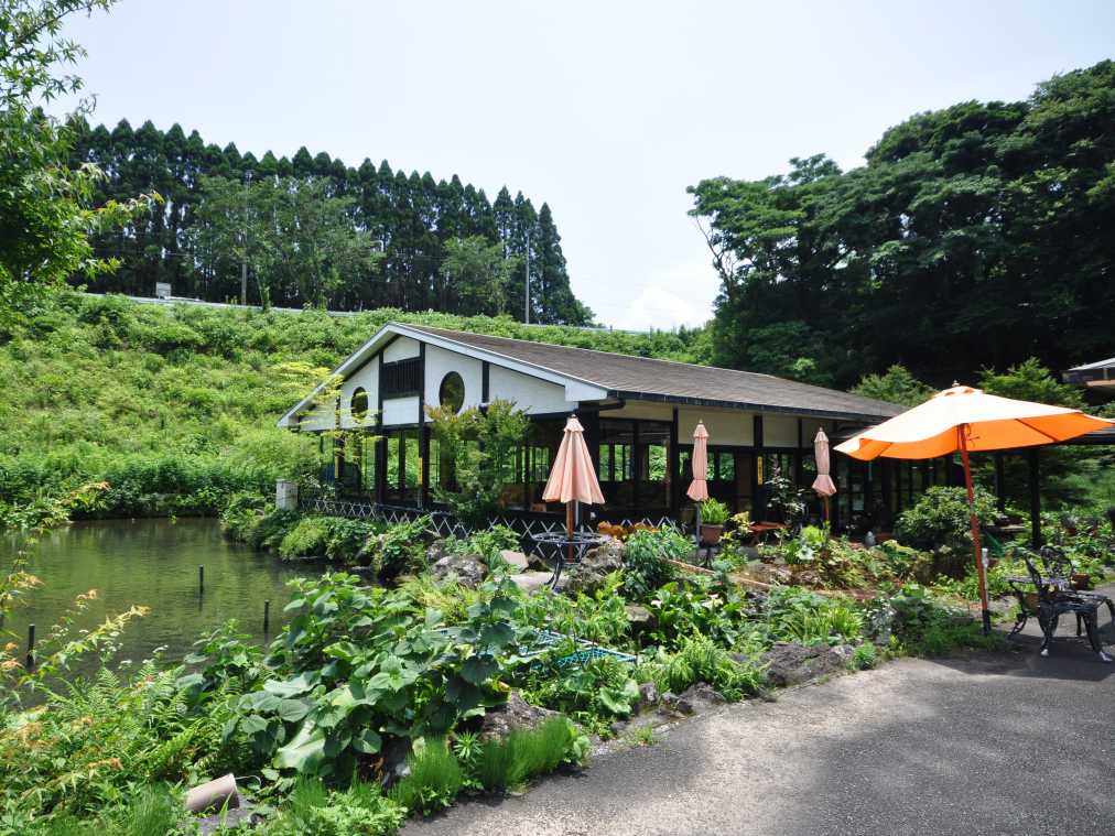 池と緑に囲まれた自然の中にあります。敷地内に釣り堀があり、自分で釣ったマスを調理してもらえるんです。