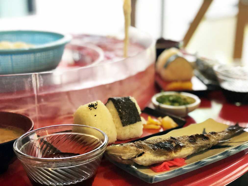 写真はB定食。そうめん、おにぎり、マスの塩焼き、鯉こくが付いて1340円。お腹イッパイになる大満足のボリュームです。