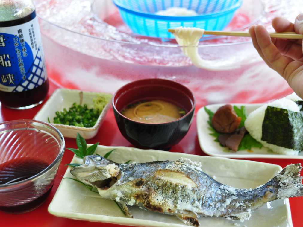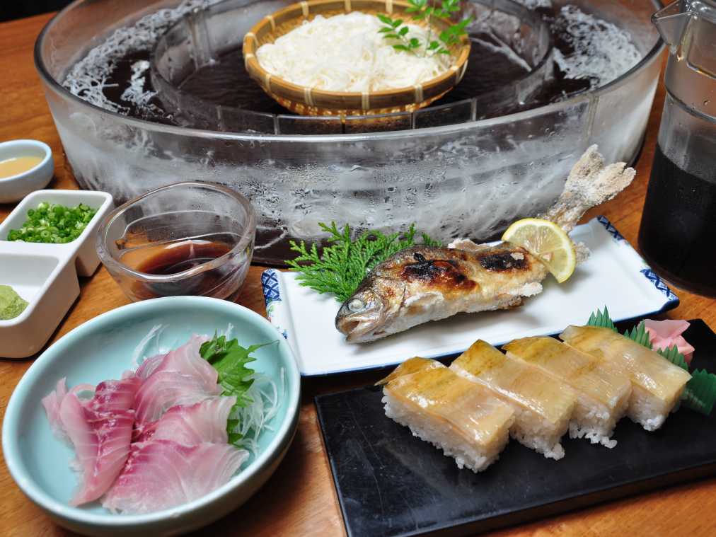 唐船峡のそうめん流しは、そうめんに、ご飯もの、マスの塩焼き、鯉こく、鯉のあらいなどがセットになったものがスタンダード。