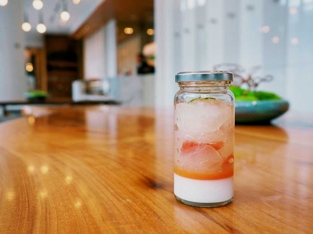 ライチが華やかに香る上品な味わいのブランマンジェと、しゅわしゅわ柔らかいゼリーが口の中で溶け合います。グレープフルーツのはじけるジューシーな甘酸っぱさと相性抜群です!