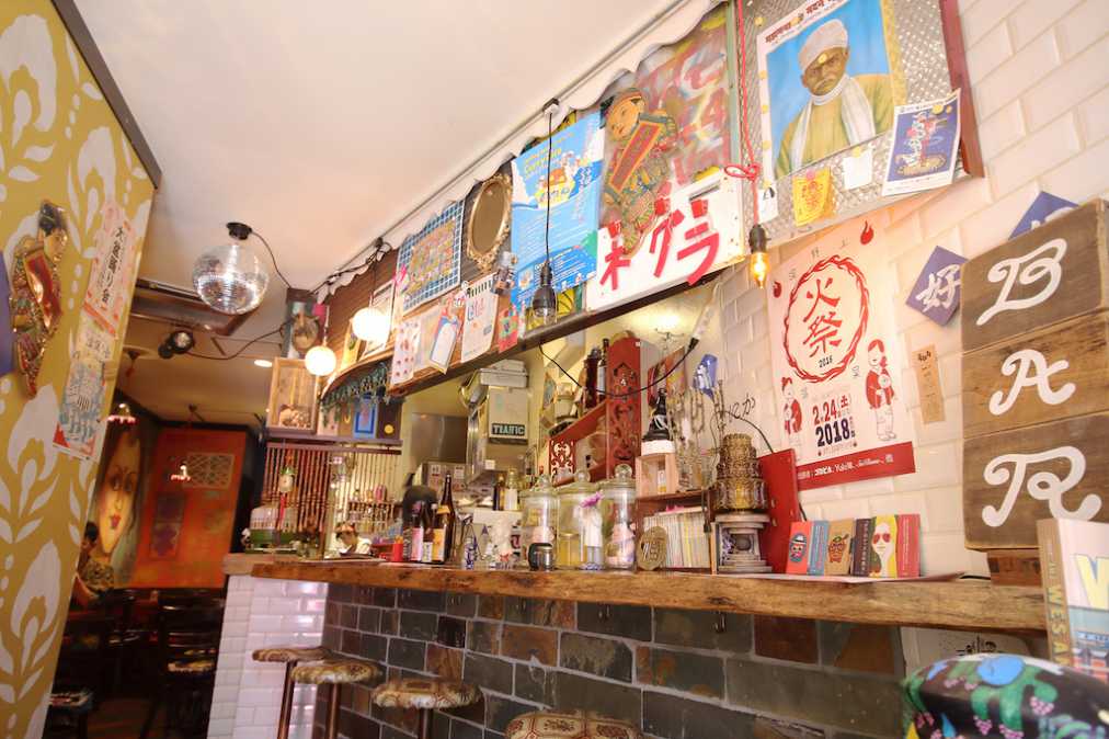自由な発想は、食事メニューだけでなく内装からも見てとれます。店内に入ってすぐの壁には中華風に「妄想魅味」の張り紙が、カウンター上部には妖しげなインド人のポスターがあり、まるでアジアの夜店のような雰囲気です。