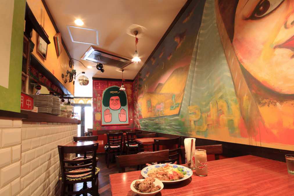 またテーブルの横の壁には大きなインド風女性とインドの宗教家として有名なサイババらしきイラストが!カレー同様に“ひと捻り”が利いたインパクト強めな空間の中、絶品の妄想インドカレーを味わうのも楽しいですね。