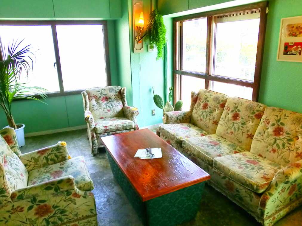 昼の12時過ぎには上階のフロアもオープンします。ソファとテーブルの14席があり、まるで映画のセットのようにレトロでかわいい空間です。
